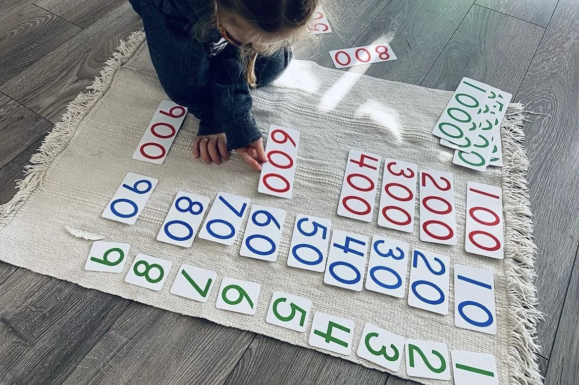 In the Math area the children explore many different math concepts. The children first explore the relationship between quantity and numerals, and they go on to explore concepts such as the decimal system, operations, fractions etc.